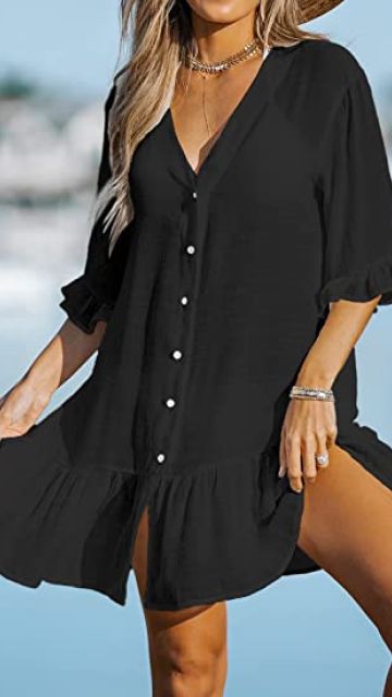 Ova elegantna plažna haljina je pravi izbor za sve modne znalce koji žele da izgledaju besprekorno i na plaži. Njen jedinstveni dizajn sa nabranim detaljima i midi dužinom će vas sigurno istaći na plaži ili bazenu. V-izrez i kratki rukavi naglašavaju vašu ženstvenost i daju haljini romantičnu notu. Pored toga, dugmad na prednjoj strani omogućavaju vam lako oblačenje i skidanje haljine preko kupaćeg kostima. Ova plažna haljina će vam omogućiti da se osećate samouvereno i elegantno, bez obzira na to gde se nalazite. Nabavite je već danas i pripremite se da zablistate na plaži!