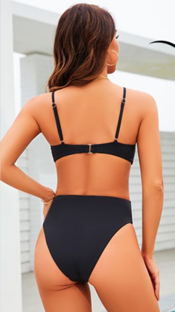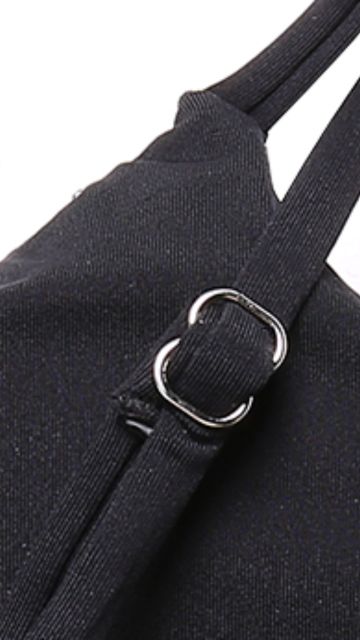 Kupaći kostim sa metalnom alkom napred, sa podesivim naramenicama i kopčom na leđima u centru. Takođe, ima sunđeraste uloške koji se mogu skinuti za podršku i oblikovanje.