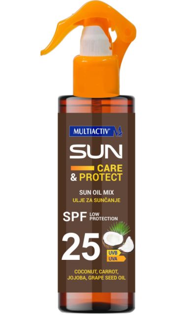 MULTIACTIV Care&Protect ulje za sunčanje SPF 25 u spreju je proizvod namenjen nezi i zaštiti kože od štetnog dejstva sunčevih zraka. Sadrži prirodna ulja kokosa, jojobe, semena grožđa i karotensko ulje, koja omekšavaju kožu. Blagotvorna kombinacija prirodnih ulja i vitamina E neguje i umiruje kožu dajući joj ravnomernu bronzanu boju. Idealno je za negu kože pre i posle sunčanja. Može se koristiti i za zaštitu kose od sunca i soli.